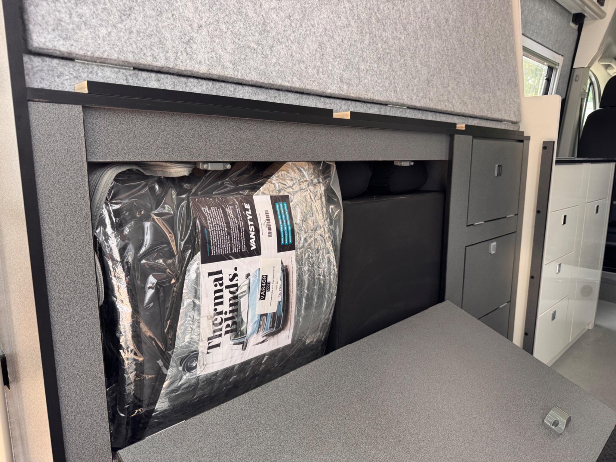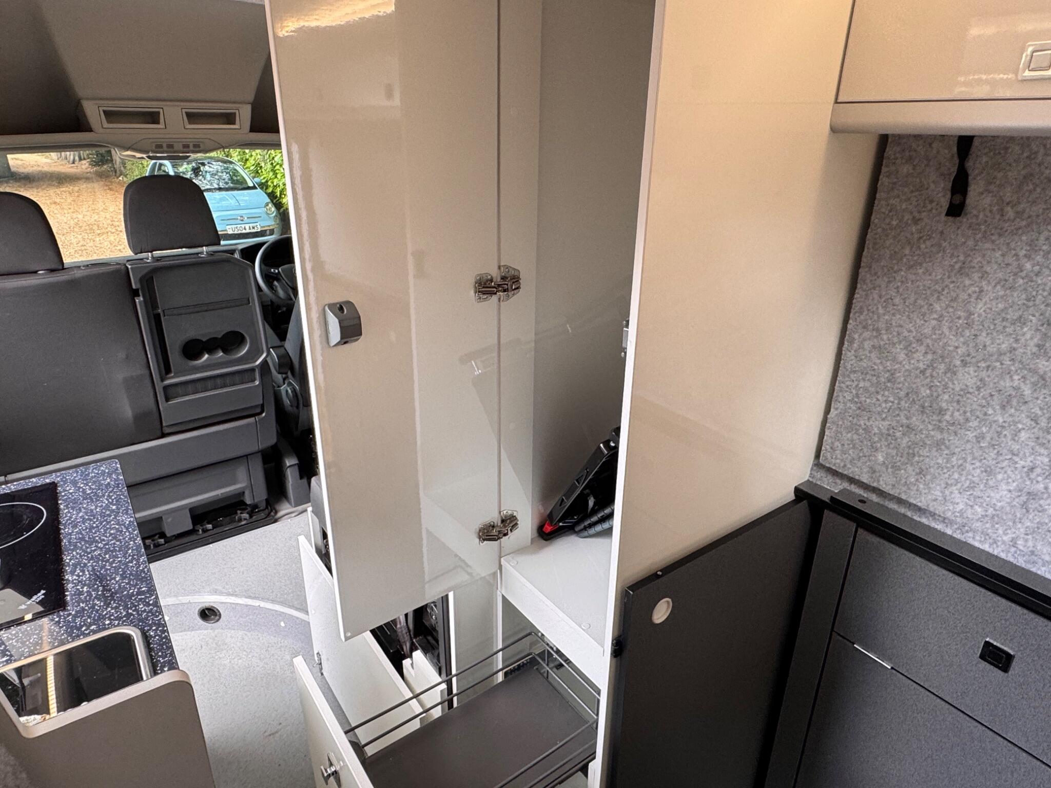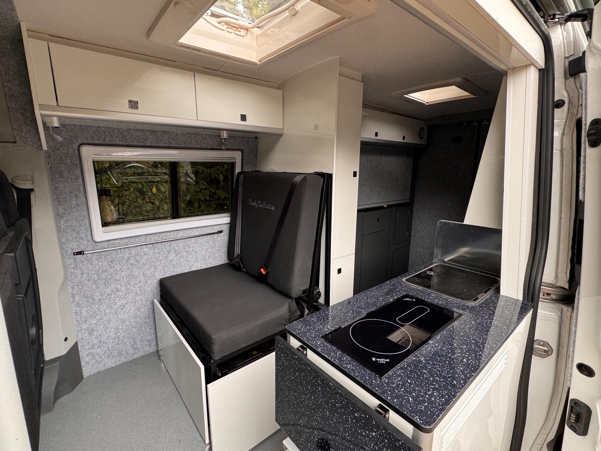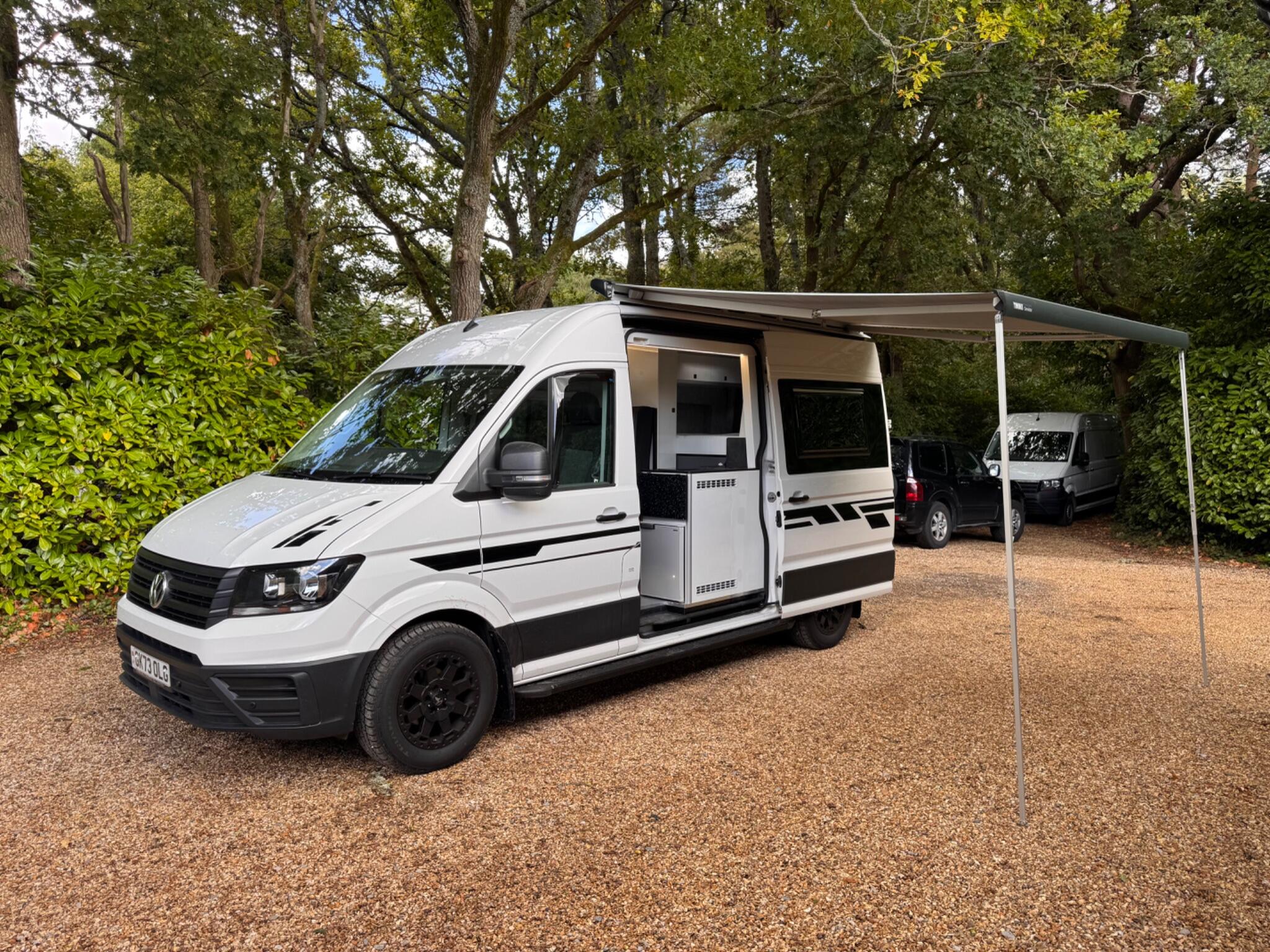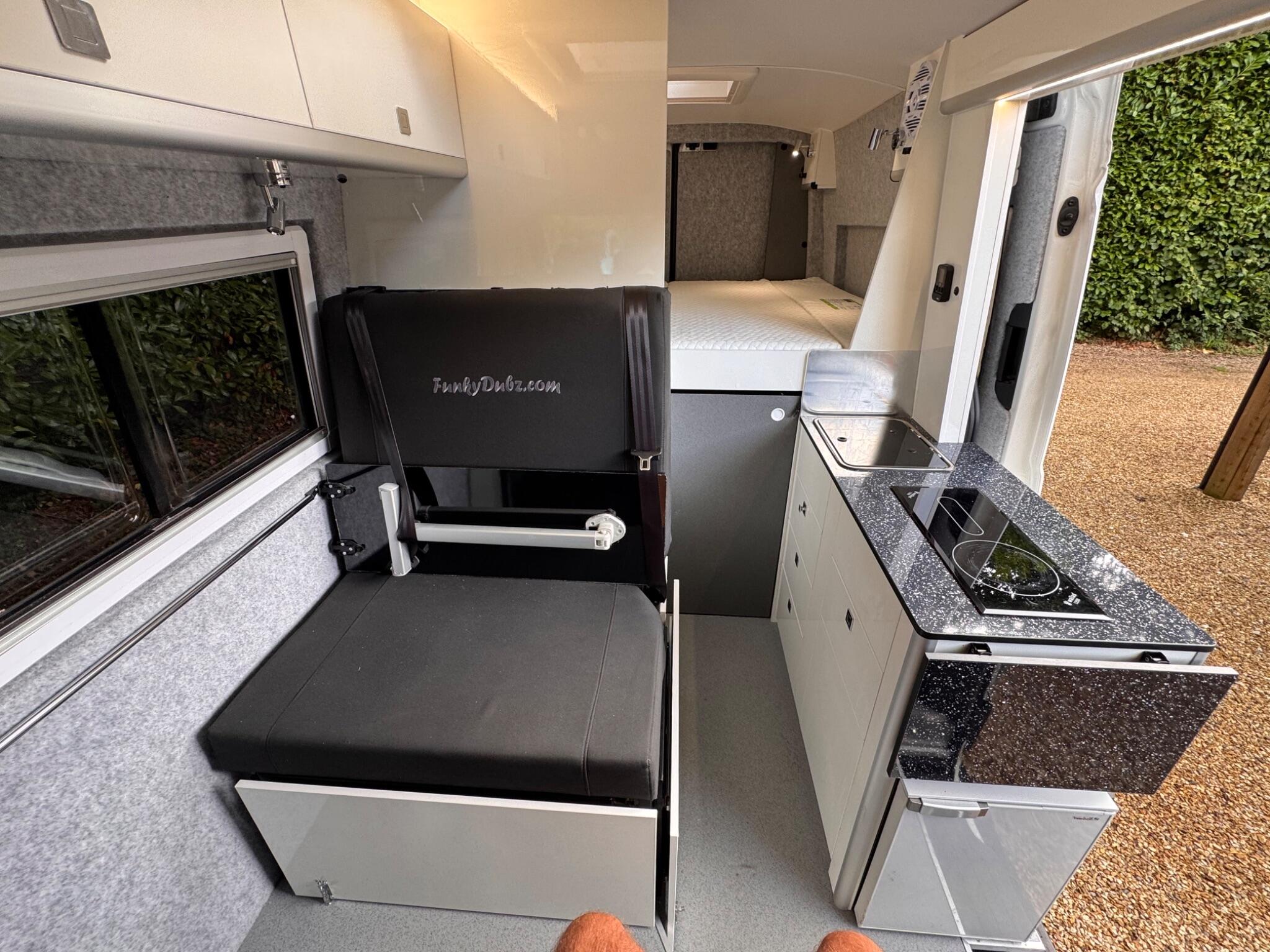 END OF SEASON SALE... FunkyDubz Medium Wheel Base Off Grid 140PS 6 Speed High Roof Crafter with 5 travelling seats, designed with immense practicality in mind, includes storage for your toys. Large fixed solar panel with lithium battery and mains hook up. Totally gas free, Diesel hob, heating and hot water. External Shower. Black Thule 6300 Wind Out Awning. Fresh and waste water storage tanks. An audio system with Feelart 8 OneSub; amp/bluetooth/sub and rear Kenwood speakers that either work from your factory head unit (with apple carplay) or stand alone when camping via bluetooth. Double bed above the garage area which can fold away for easy access, with comfy mattress. Tested double seatbed in living area which folds forward and to the side into a bed for two along with the swivelled front seats. Three good sized fixed roof lights (with blind and flyscreen), offside sliding window and nearside hinged opener, both double glazed with blinds & flyscreen, also side pods for rear bed for extra length finished in black to match windows. Storage wise there are pods above beds, a tall slide out storage unit and various storage areas. Kitchen area has diesel ceramic hob, accessible both from inside and outside, no visible flame to blow out, fridge also accessible from inside or out, cutlery drawer etc. Chemical toilet with storage. Well insulated with carpet lining/roof board, cabinetry in Gloss White non slip flooring to living area and rubberised flooring to garage area. Outside this vehicle benefits from a black Thule Omnistore wind out awning, Black 18" alloy wheels with all terrain tyres, vehicle graphics, side steps. Factory equipment includes air conditioning, multi function steering wheel and cruise control, app connect/apple play for media and satnav functionality, front & rear parking sensors. Both front seats swivel to enable full use of available space.